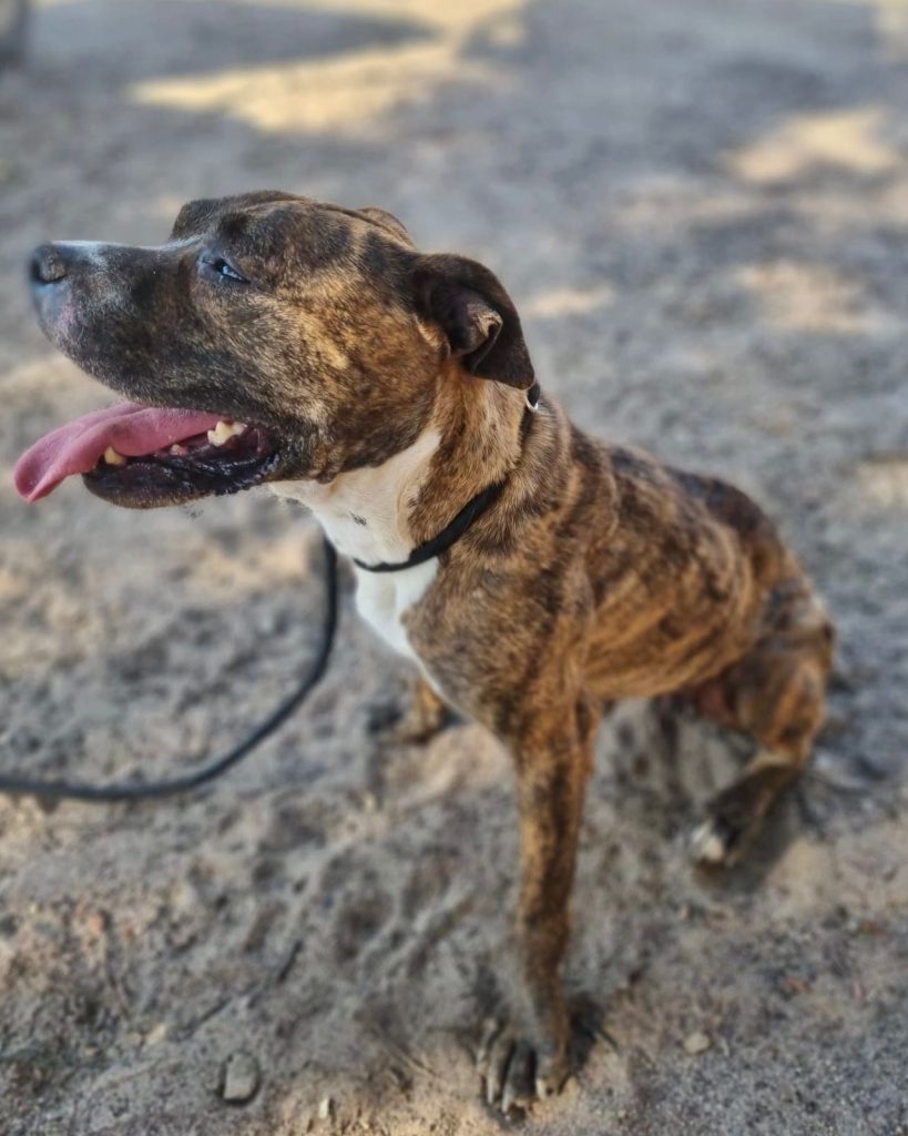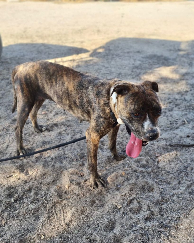 Es muy dulce, va genial con la correa y no tiene problemas con otros perros —de hecho, está en el patio más tranquilo que tenemos—, pero ni aun así consigue relajarse del todo. Le cuesta, se entristece, y se nota.