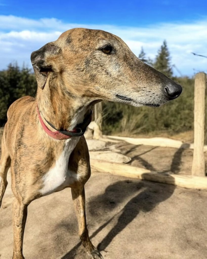 Pegaso es un galgo muy simpático y tranquilo. Es muy fácil relacionarse con él porque es muy sociable y cariñoso y le gusta todo lo que le hagas si eso supone que le prestes atención y le des unos mimos después.